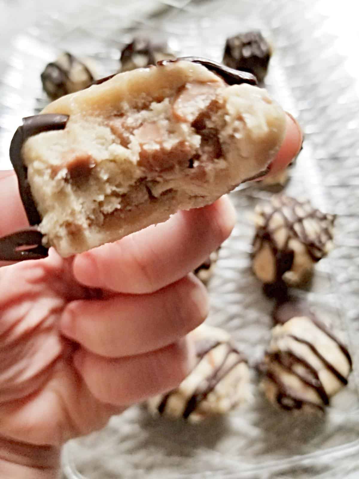 The reason it can be dangerous to eat raw cookie dough is because it normally contains eggs that aren’t cooked. Even raw flour can contain bacteria. So in this Chocolate Covered Cookie Dough recipe, we don’t use eggs and you can microwave the flour for just over a minute to help kill any harmful bacteria.