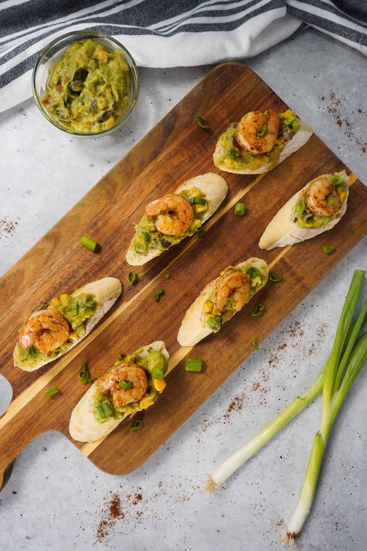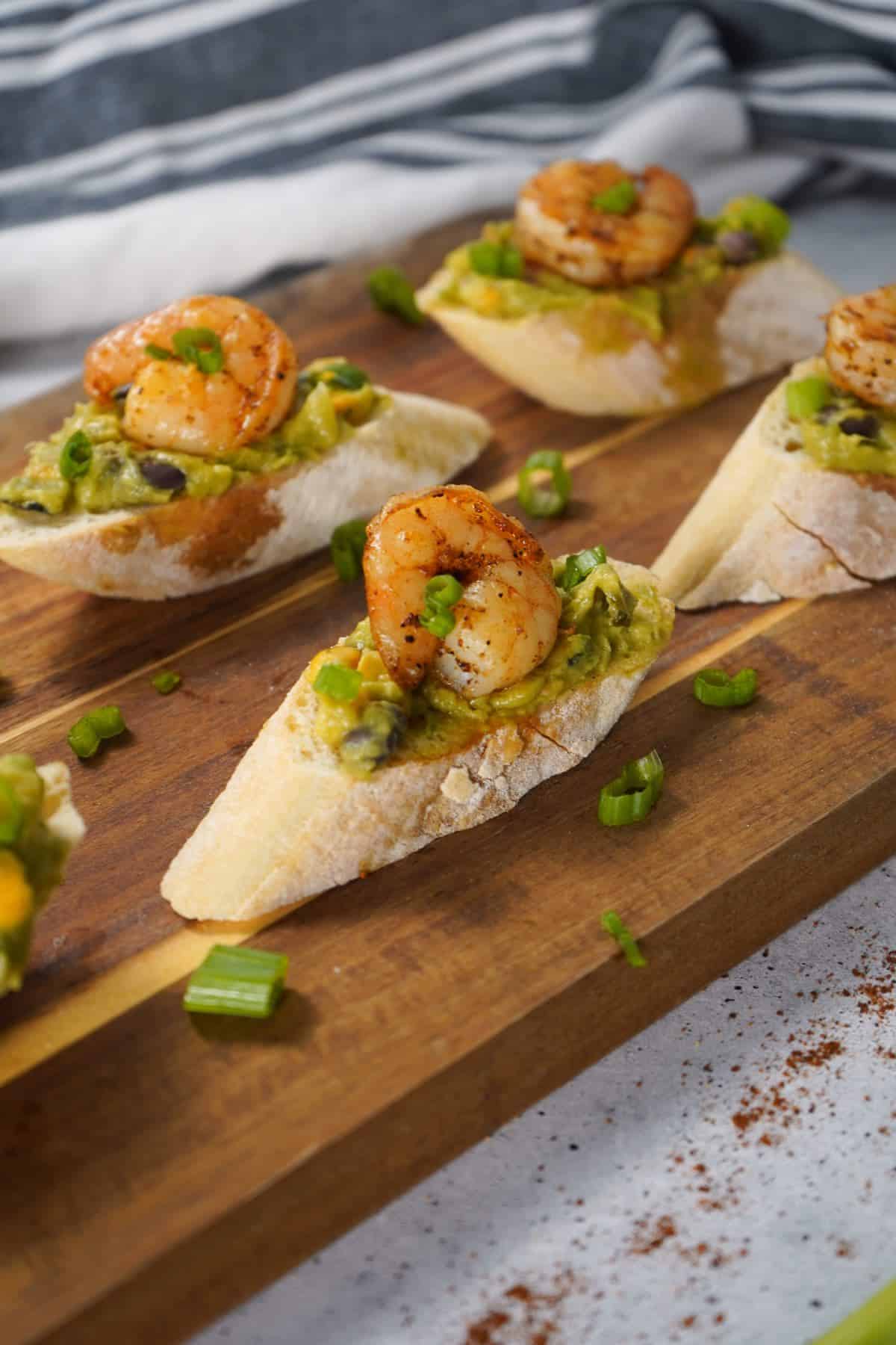Step 4: Top with Shrimp. Place a cooked shrimp on each slice, sprinkle with chopped green onions, and ta-da! You have a little fancy appetizer that’s actually super easy.