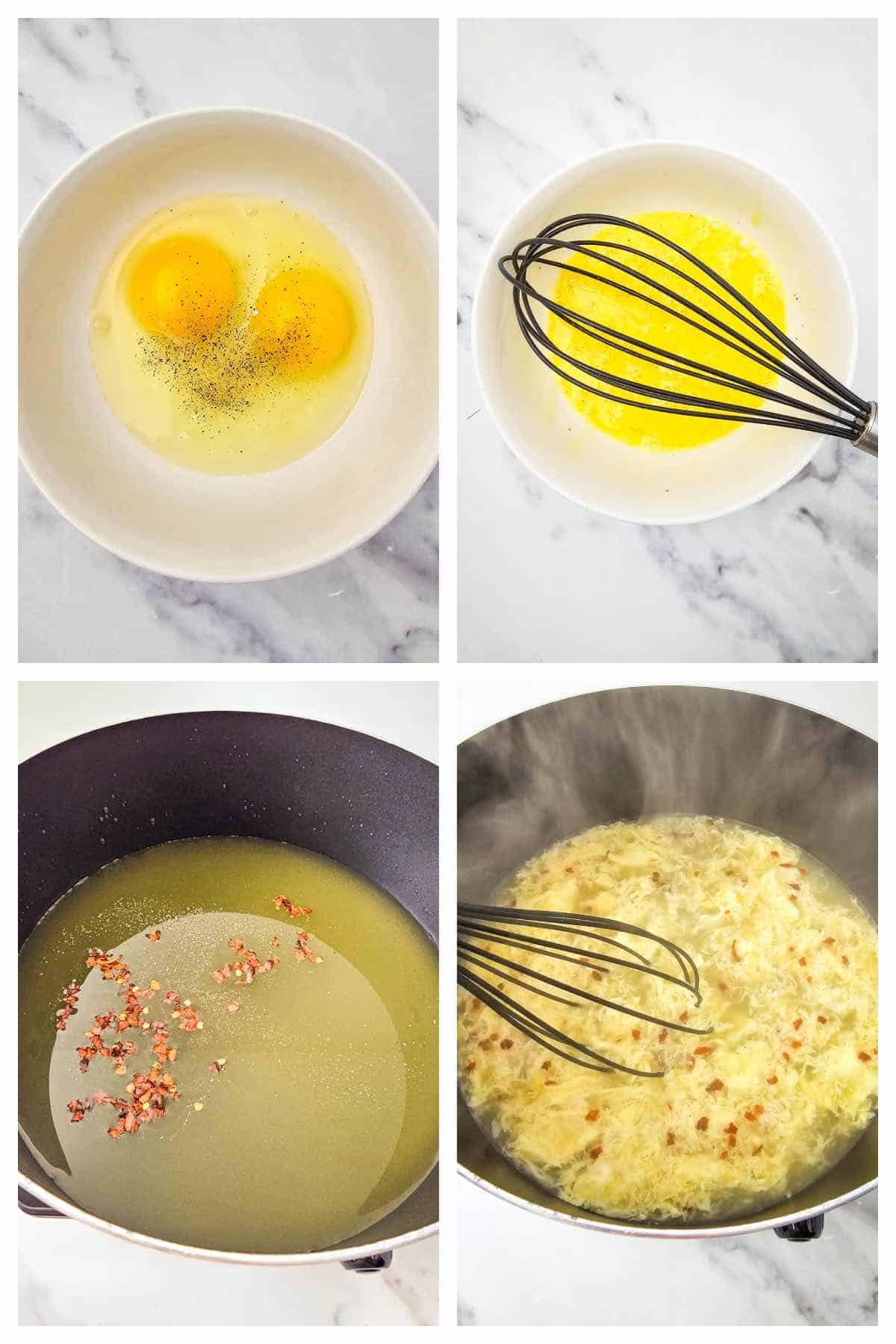 Step 3: Add the eggs. Once the broth is boiling, slowly pour the whisked eggs into the pot while stirring gently in one direction. The eggs will cook instantly and form light strands throughout the soup.